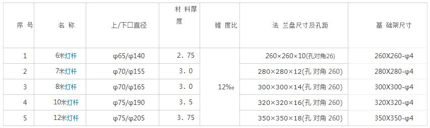 一、標(biāo)準(zhǔn)燈桿 尺寸參數(shù)表